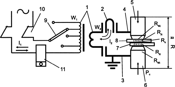 Электрическая часть включает в себя силовой сварочный трансформатор 1 с переключателем ступеней 2 его первичной обмотки, с помощью которого регулируют вторичное напряжение, вторичный сварочный контур 3 для подвода сварочного тока к деталям, прерыватель 4 первичной цепи сварочного трансформатора 1 и регулятор 5 цикла сварки, обеспечивающий заданную последовательность операций цикла и регулировку параметров режима сварки.