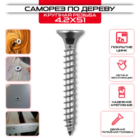 В каталоге нашей компании в широком ассортименте представлен этот вид крепежа. Большинство саморезов по дереву имеют потайную головку, так как подобное исполнение наиболее удобно при работе с данным материалом. Также, если после произведения монтажа головку зашпаклевать или закрасить, то крепление будет вовсе незаметно. С этим связано широкое применение самореза по дереву в домостроительстве, в наружной и внутренней отделке. Их активно используют при сборке мебели.