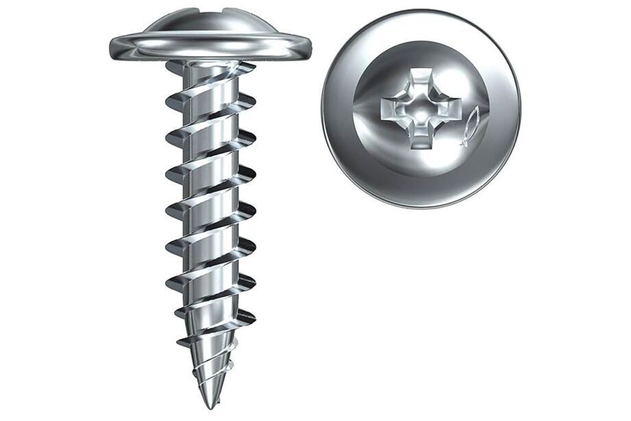 Большая острая резьба этого шурупа позволяет ему самостоятельно ввинчиваться как в пластик, так и в дерево.