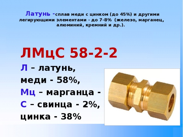 Остальные элементы называются легирующими и используются для усовершенствований показателей металла. Доля легирующих составных в бронзе может быть от 2,5%. Применяют в этом качестве марганец, олово, свинец, хром, фосфор, железо и другие элементы, кроме цинка. Сочетание меди и цинка, носит наименование латуни.