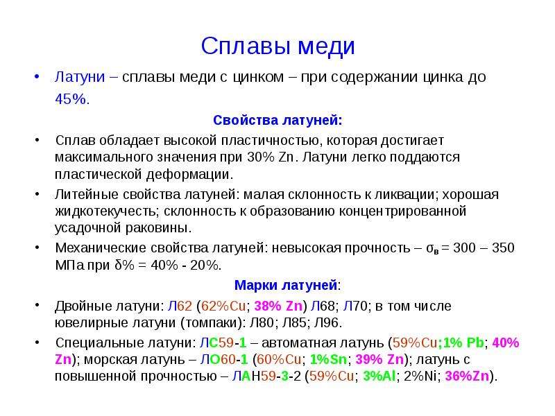 Свойства латуни. Состав латуни.