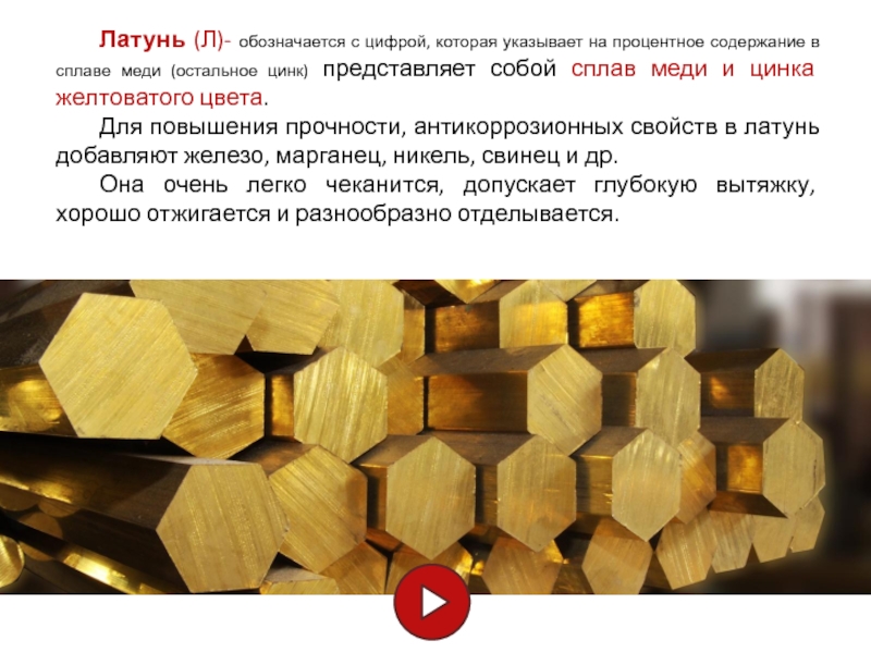 Латунь — сплав меди с цинком. С введением третьего, четвертого и более компонентов латуни именуют сложными, или специальными, и они получают название алюминиевой латуни, железомарганцевой латуни, марганцево- оловянно-свинцовой латуни и т.д. По сравнению с медью они обладают большими прочностью, коррозионной стойкостью, упругостью и лучшей обрабатываемостью (литьем, давлением, резанием).