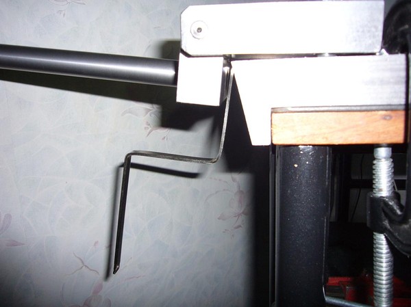 И так, всё почти готово, осталось только продумать регулировку ролика по высоте. Для этого будет задействован винт, вкрученный в верхнюю перекладину. Его автор немного обточил с торца. Затем в торце просверлил строго по центру отверстие и нарезал в нем резьбу. Вкрутил винт обратно в гайки так, чтобы он уперся в полку уголка. Маркером поставил отметки на полке и просверлил в ней отверстие диаметром, равным диаметру сточенной части. Выкрутил винт и навинтил на него широкую гайку до самого упора (до шляпки). Затем в этой гайке, в грани, просверлили отверстие. В него будет установлен отрезок прутка для того, чтобы было удобно вращать винт при регулировке ролика. По ходу статьи всё увидите сами.После того как отверстие в полке было просверлено, автор установил на свое место уголок и прикрутил его маленьким винтиком к торцу винта. Теперь ролик будет за счет вращения винта плавно передвигаться вниз или вверх.