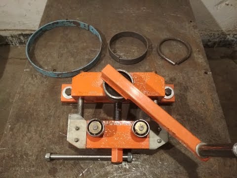 Взял отрезок металлической полосы и пропустил его между подшипниками и роликом, одновременно поджимая его винтом. Как видим, полоса изгибается, при этом можно легко выставить желаемый радиус. Сначала он согнул полосу в дугу, затем поджал ролик и получился почти готовый круг. Далее подрезал края заготовки и снова пропустил её через приспособление. В итого получилось ровное кольцо.