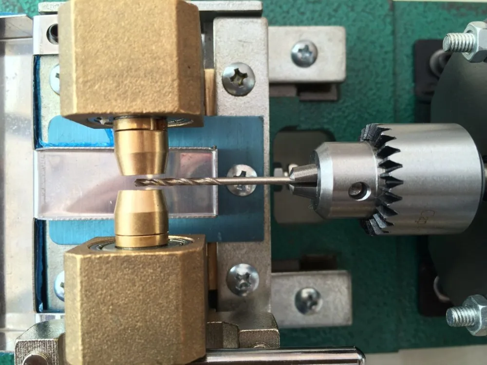 Длина режущей части составляет приблизительно 5% от общей длины сверла; длина гладкого хвостовика составляет 85—88% общей длины. Остальная длина приходится на переходную часть между хвостовиком и режущей частью. Торец хвостовика сверла должен быть плоским и строго перпендикулярным к оси сверла. На хвостовике не допускаются заусенцы, вмятины и маркировочные знаки. Шероховатость поверхности должна быть Rz sg 0,040 мкм. Для сверления отверстий диаметром от 0,15 мм и более применяют спиральные твердосплавные сверла, а для отверстий менее 0,15 мм используют перовые сверла с твердосплавной режущей частью и стальным цилиндрическим хвостовиком. Время сверления отверстия диаметром 0,13 мм в изделии толщиной 1,27 мм составило 6 с. Общим недостатком сверлильных станков с пневматическим приводом является нестабильность скорости вращения шпинделя и относительно большой расход сжатого воздуха.