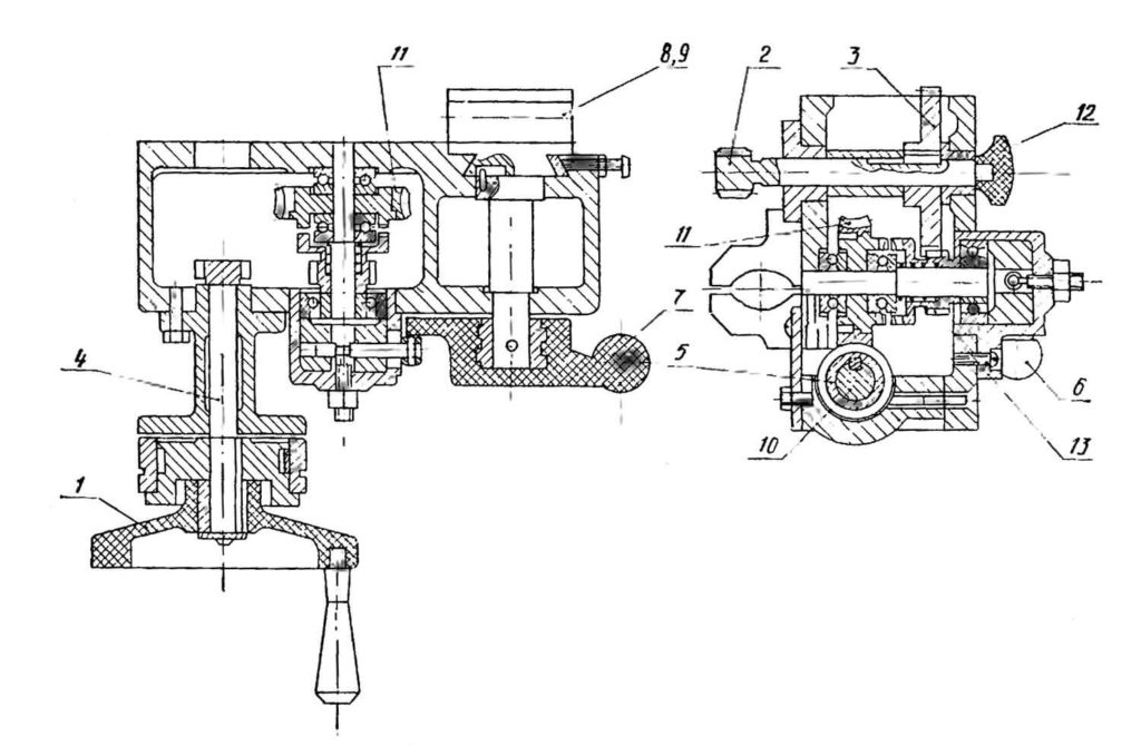 - Рукоятка включения маточной гайки 13 — в нижнем крайнем положении.
