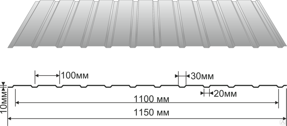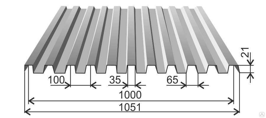 - Высота гребня — чем она больше, тем прочнее и жёстче лист, но при равной длине имеет меньшую площадь. Максимальный размер волны зафиксирован 114 мм, а в частном строительстве — 44 мм.