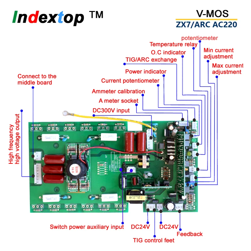 Внешний вид платы сварки TELWIN Force 165 с указанием расположения некоторых элементов схемы.