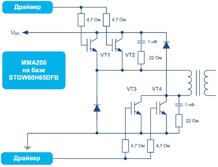 Но где взять эти самые 60-80 кГц, если частота переменного тока электросети всего 50 Гц? Тут на выручку приходит инверторная схема, которая состоит из мощных ключевых транзисторов, которые переключаются с частотой 60-80 кГц.
