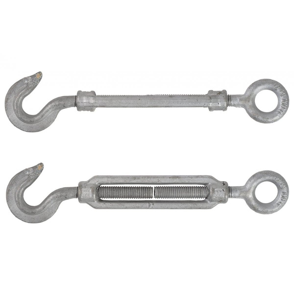 Резьбовые части стержней крюка и кольца изготовлены с левой и правой резьбой. Для наглядности их можно сравнить с болтами, имеющими удлиненные стержни, в которых вместо головок обычной шестигранной формынаходятся кольца или крюки.
