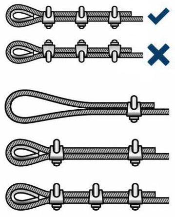Суть сопряжения канатов проста. При построении канатной петли, нужно свободный конец троса приложить к его телу на такое расстояние, чтобы можно было установить минимум три зажима. Между ними должно быть расстояние не менее шести диаметров. От их правильного расположения зависит прочность соединения. Так, тело фиксатора должно находиться со стороны тела каната, а прижимная планка должна придавливать конец к его телу.