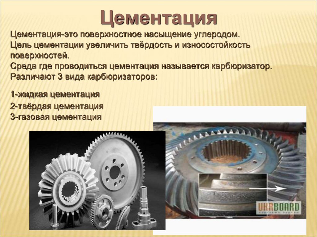 Цементация изделий — это процедура, которая может выполняться на всех металлических компонентах, даже если она проводится на тех объектах, которые требуют устойчивости к износу, особенно в долгосрочной перспективе, и значительной устойчивости к ударам. Типичными примерами этой продукции являются детали трансмиссии автомобилей, зубчатые передачи, распределительные валы, пальцы и многие другие. Большинство компаний, занимающихся цементацией сталей, имеют технологичное оборудование, позволяющее работать даже с изделиями больших размеров и весом до 2 тонн.