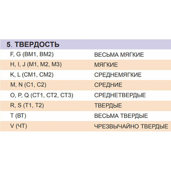 Таким образом, величина, характеризующая свойство абразивного инструмента сопротивляться нарушению сцепления между зернами и связкой при сохранении характеристик инструмента в пределах установленных норм, называется твердостью. Шкала твердостей абразивного инструмента состоит из 8 основных степеней твердости. Цифры 1, 2, 3 характеризуют возрастание твердости внутри одной степени.