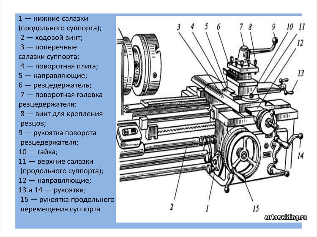 От коробки скоростей вращается вал или винт. Они обеспечивают продольное перемещение суппорта с салазками, на которых установлен резец. Для поперечного точения на большинстве моделей надо вращать ручку салазок, автоматического перемещения нет.