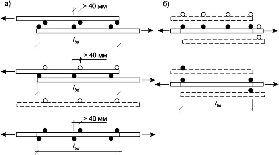 Соединения внахлестку не следует использовать для стержней диаметром более 36 мм. В этом случае следует провести сварку. Но если сварка невозможна, то для прутков диаметром более 36 мм может быть разрешена притирка. Вокруг стержней внахлест должны быть предусмотрены дополнительные спирали.