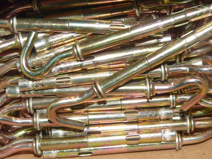 Анкерный болт с крюком. Имеет много общего с предыдущим видом. На конце стержня в этой модификации установлен изогнутый крюк. С ним проще монтировать подвесные конструкции. Например, элементы подвесных потолков. Функция гайки в болте с крюком заключается в разжиме втулки, за счет чего болт надежно фиксируется. При монтаже конструкции на крюк при необходимости ее легко извлечь.