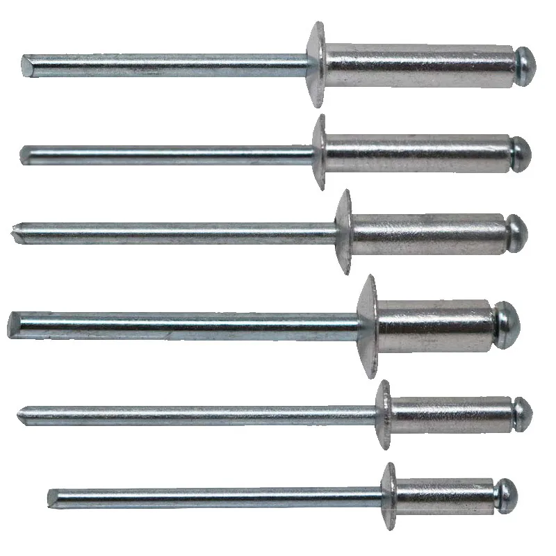 Заклепочные заклепки представляют собой тип вытяжных заклепок с небольшим выступающим стержнем из головки. После вставки приводных заклепок в отверстие оправку забивают молотком или другим инструментом, чтобы закрепить конец заклепки внутри отверстия.