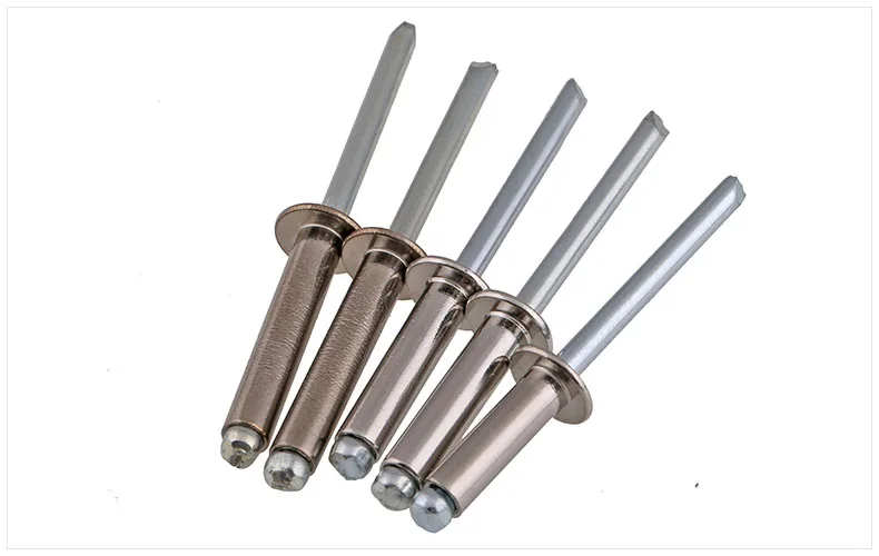 - Вытяжные заклепки с окрашенными головками : Эти вытяжные заклепки имеют окрашенную головку для создания индивидуального или улучшенного внешнего вида или для того, чтобы сделать заклепки менее заметными. Окрашенные заклепки можно использовать для самых разных целей, включая установку вывесок или табличек с именами, создание нестандартных дизайнов, а также для использования с окрашенными или цветными металлами.