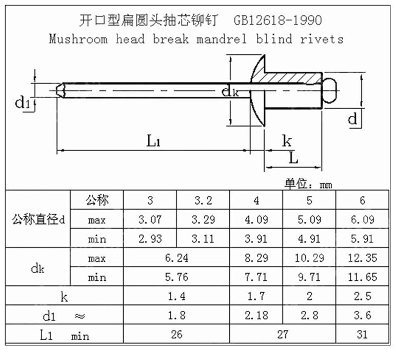 В таблице указаны технические характеристики заклепок, соответствующих требованиям ГОСТа 10300-80. Обозначены эти параметры так же, как и на чертеже.