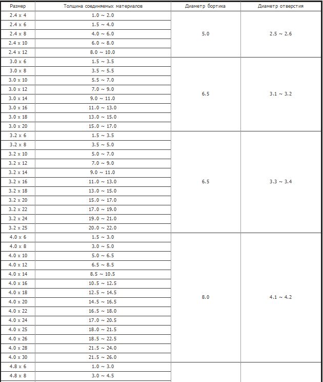 Длину заклёпки с протяжкой можно определить с помощью следующей таблицы, в зависимости от толщины скрепляемых материалов (производитель настоятельно не рекомендует применять заклёпки для склёпывания материалов толщиною менее нижнего рекомендуемого предела и выше верхнего предела).