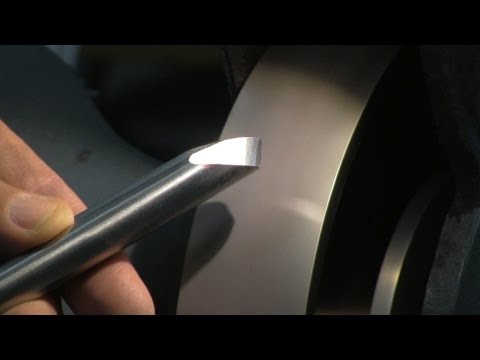 Приложив к диску фаску резца, настройте подручник для заточки фасок под углом 20°. Перемещайте рабочий конец резца по диску из стороны в сторону. Регулярно переворачивайте инструмент и вставляйте конец его ручки в другой V-образный вырез упора, чтобы режущая кромка располагалась точно посередине толщины клинка.