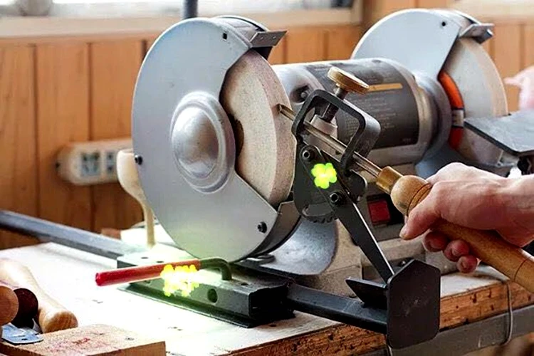 Наиболее распространенным средством заточки токарных инструментов является настольный шлифовальный станок. Вы можете заточить свои новые инструменты вручную, используя подставку для инструментов, которая идет в комплекте с точильным станком, но для этого требуется опытная рука, и не так просто воспроизвести существующую заточку (форму и размер фаски).